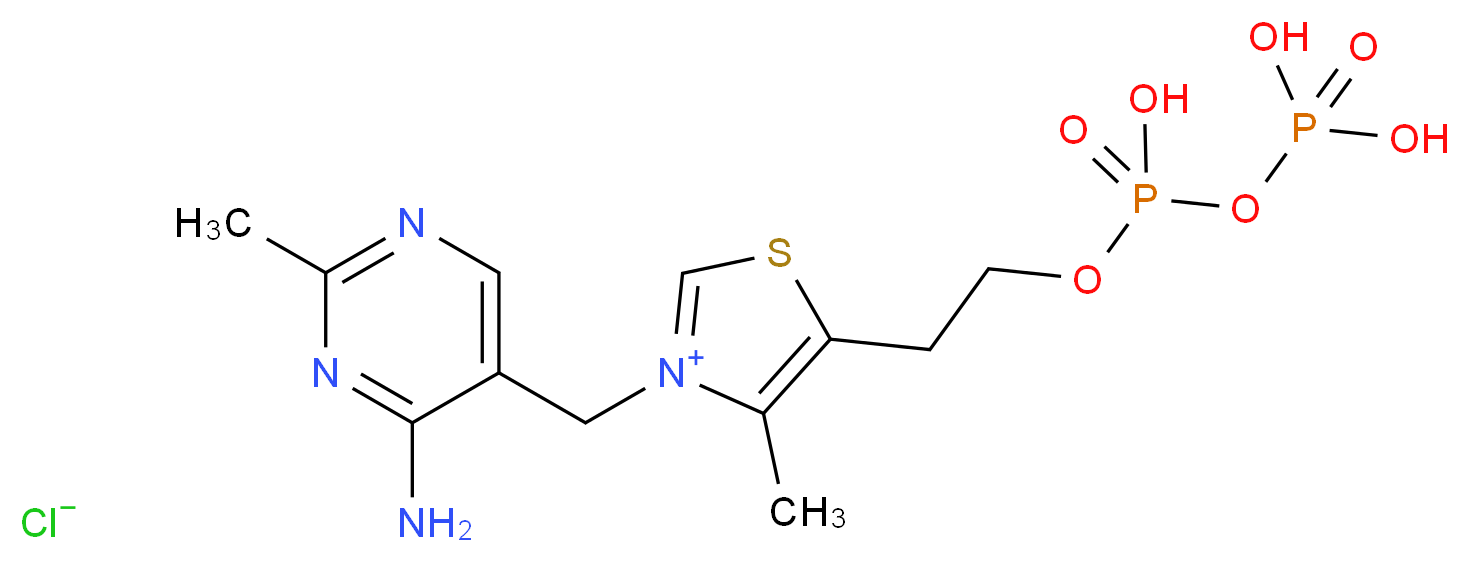 SMILES: [Cl-].Cc1ncc(C[n+]2csc(CCOP(=O)(O)OP(=O)(O)O)c2C)c(N)n1 Canonical SMILES: Cc1ncc(c(n1)N)C[n+]1csc(c1C)CCOP(=O)(OP(=O)(O)O)O.[Cl-] InChI: InChI=1S/C12H18N4O7P2S.ClH/c1-8-11(3-4-22-25(20,21)23-24(17,18)19)26-7-16(8)6-10-5-14-9(2)15-12(10)13;/h5,7H,3-4,6H2,1-2H3,(H4-,13,14,15,17,18,19,20,21);1H InChIKey: YXVCLPJQTZXJLH-UHFFFAOYSA-N