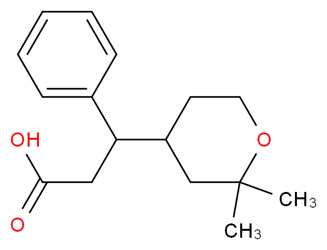 SMILES: C1OC(CC(C1)C(CC(=O)O)c1ccccc1)(C)C Canonical SMILES: OC(=O)CC(c1ccccc1)C1CCOC(C1)(C)C InChI: InChI=1S/C16H22O3/c1-16(2)11-13(8-9-19-16)14(10-15(17)18)12-6-4-3-5-7-12/h3-7,13-14H,8-11H2,1-2H3,(H,17,18) InChIKey: BJEUBLWZXDCPQM-UHFFFAOYSA-N