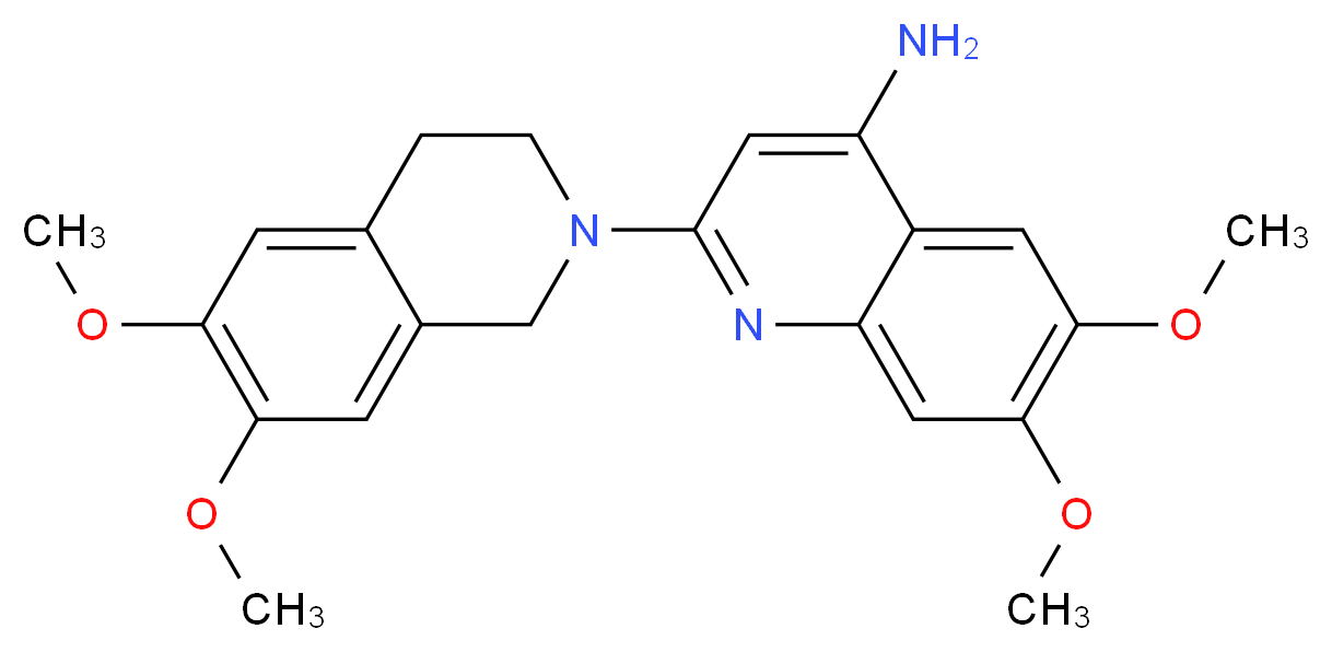 SMILES: COc1c(cc2CN(CCc2c1)c1nc2cc(c(cc2c(c1)N)OC)OC)OC Canonical SMILES: COc1cc2CCN(Cc2cc1OC)c1cc(N)c2c(n1)cc(c(c2)OC)OC InChI: InChI=1S/C22H25N3O4/c1-26-18-7-13-5-6-25(12-14(13)8-19(18)27-2)22-10-16(23)15-9-20(28-3)21(29-4)11-17(15)24-22/h7-11H,5-6,12H2,1-4H3,(H2,23,24) InChIKey: ANZIISNSHPKVRV-UHFFFAOYSA-N