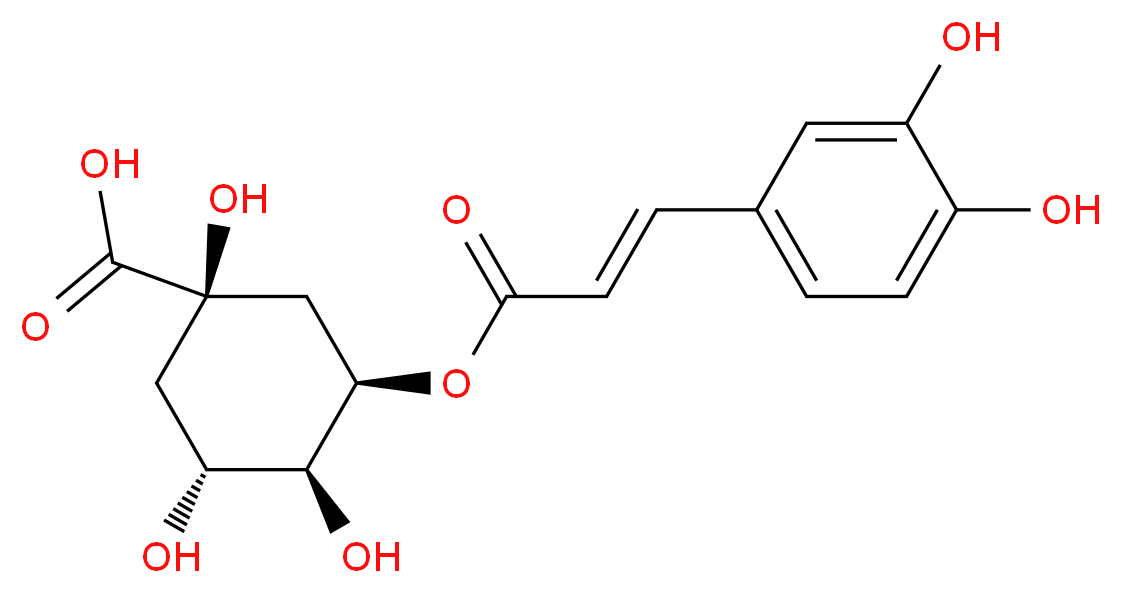 SMILES: O=C(O)[C@@]1(O)C[C@@H](O)[C@H](O)[C@H](OC(=O)/C=C/c2ccc(O)c(O)c2)C1 Canonical SMILES: O=C(O[C@@H]1C[C@](O)(C[C@H]([C@@H]1O)O)C(=O)O)/C=C/c1ccc(c(c1)O)O InChI: InChI=1S/C16H18O9/c17-9-3-1-8(5-10(9)18)2-4-13(20)25-12-7-16(24,15(22)23)6-11(19)14(12)21/h1-5,11-12,14,17-19,21,24H,6-7H2,(H,22,23)/b4-2+/t11-,12-,14+,16-/m1/s1 InChIKey: CWVRJTMFETXNAD-NXLLHMKUSA-N