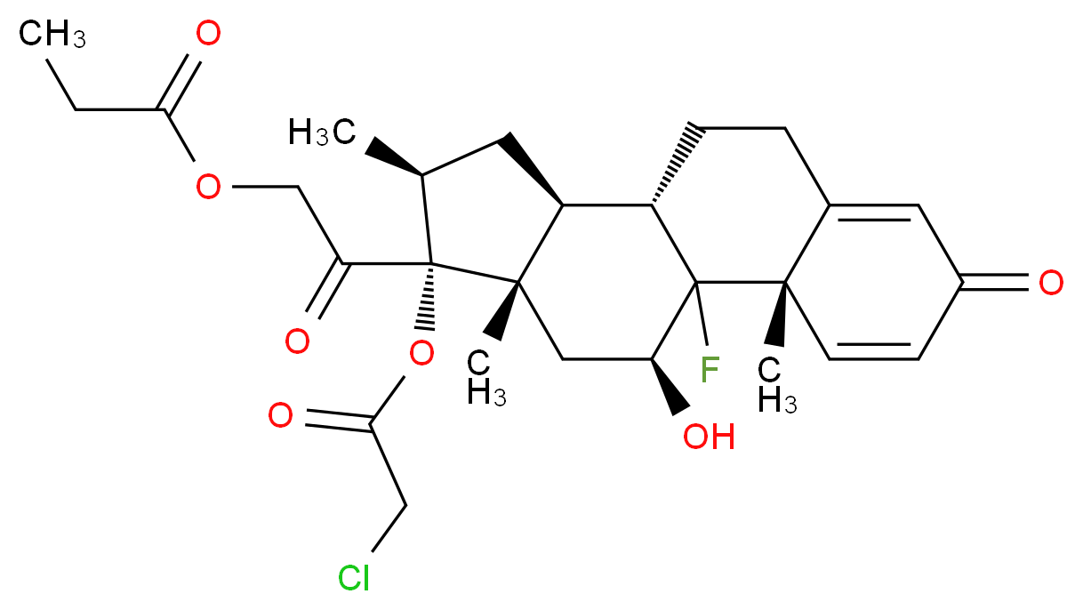 SMILES: CCC(=O)OCC(=O)[C@]1([C@H](C[C@@H]2[C@@]1(C[C@@H](C1([C@H]2CCC2=CC(=O)C=C[C@]12C)F)O)C)C)OC(=O)CCl Canonical SMILES: ClCC(=O)O[C@@]1([C@@H](C)C[C@@H]2[C@]1(C)C[C@H](O)C1([C@H]2CCC2=CC(=O)C=C[C@]12C)F)C(=O)COC(=O)CC InChI: InChI=1S/C27H34ClFO7/c1-5-22(33)35-14-21(32)27(36-23(34)13-28)15(2)10-19-18-7-6-16-11-17(30)8-9-24(16,3)26(18,29)20(31)12-25(19,27)4/h8-9,11,15,18-20,31H,5-7,10,12-14H2,1-4H3/t15-,18-,19-,20-,24-,25-,26?,27-/m0/s1 InChIKey: UOCNBCVPZWLUKX-HOBFILNXSA-N