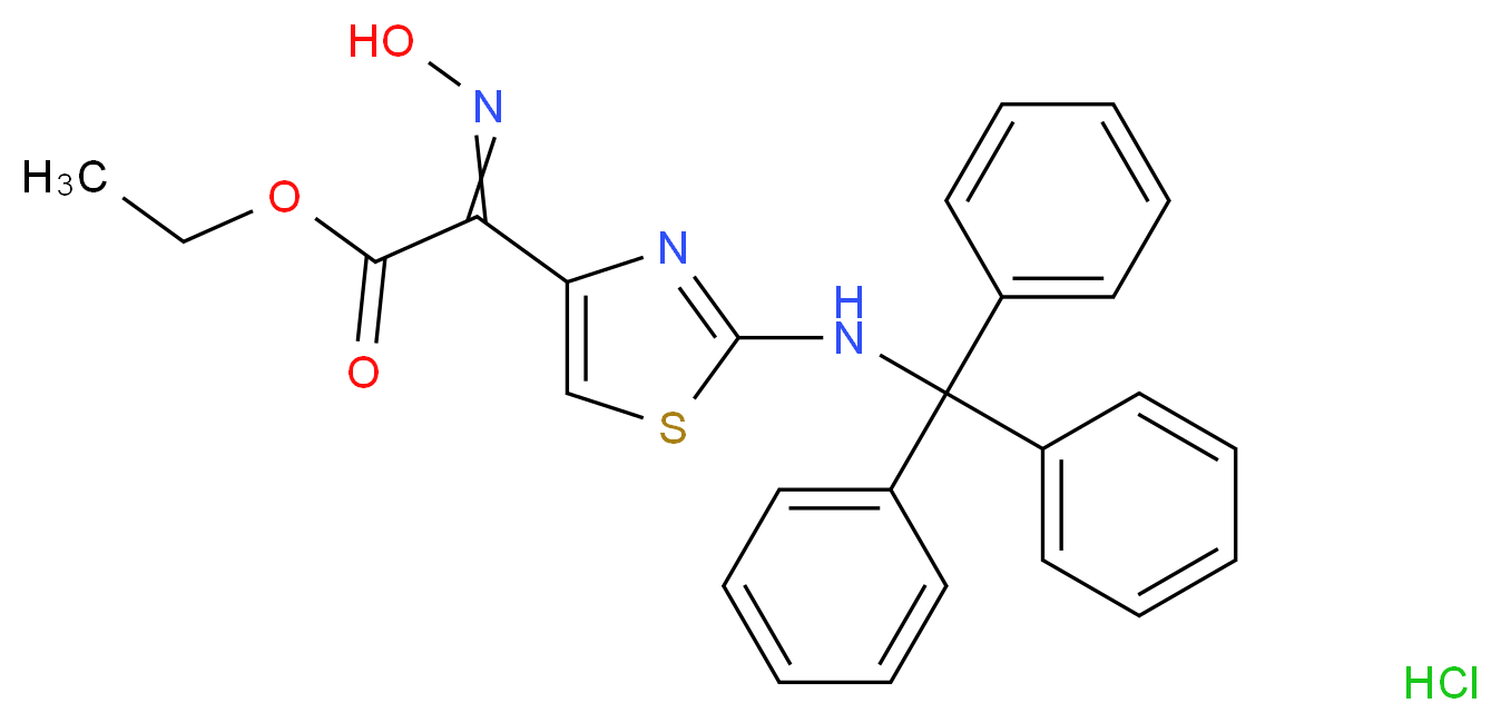 SMILES: CCOC(=O)/C(=N/O)/c1csc(n1)NC(c1ccccc1)(c1ccccc1)c1ccccc1.Cl Canonical SMILES: CCOC(=O)/C(=N/O)/c1csc(n1)NC(c1ccccc1)(c1ccccc1)c1ccccc1.Cl InChI: InChI=1S/C26H23N3O3S.ClH/c1-2-32-24(30)23(29-31)22-18-33-25(27-22)28-26(19-12-6-3-7-13-19,20-14-8-4-9-15-20)21-16-10-5-11-17-21;/h3-18,31H,2H2,1H3,(H,27,28);1H InChIKey: POPNOGAIIMCRTH-UHFFFAOYSA-N