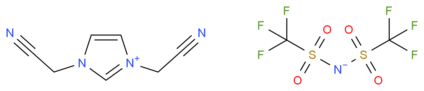 SMILES: c1c[n+](cn1CC#N)CC#N.C(F)(F)(F)S(=O)(=O)[N-]S(=O)(=O)C(F)(F)F Canonical SMILES: O=S(=O)(C(F)(F)F)[N-]S(=O)(=O)C(F)(F)F.N#CCn1cc[n+](c1)CC#N InChI: InChI=1S/C7H7N4.C2F6NO4S2/c8-1-3-10-5-6-11(7-10)4-2-9;3-1(4,5)14(10,11)9-15(12,13)2(6,7)8/h5-7H,3-4H2;/q+1;-1 InChIKey: ORJULSCFWHFTFU-UHFFFAOYSA-N