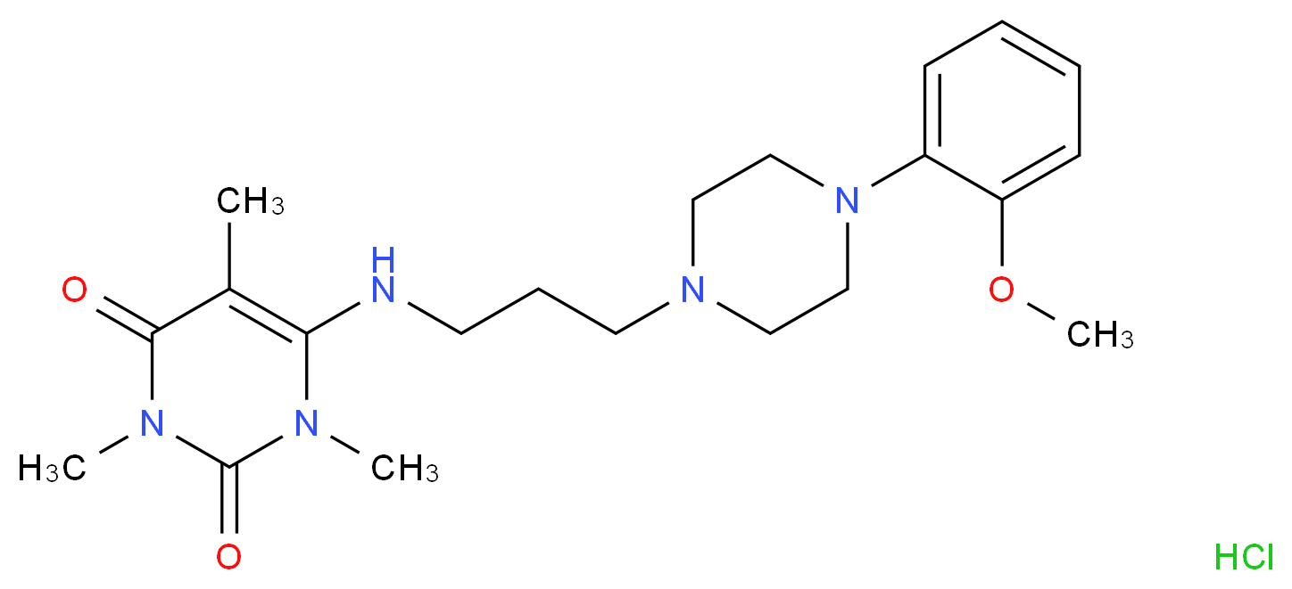 SMILES: Cc1c(n(c(=O)n(c1=O)C)C)NCCCN1CCN(CC1)c1ccccc1OC.Cl Canonical SMILES: COc1ccccc1N1CCN(CC1)CCCNc1c(C)c(=O)n(c(=O)n1C)C.Cl InChI: InChI=1S/C21H31N5O3.ClH/c1-16-19(23(2)21(28)24(3)20(16)27)22-10-7-11-25-12-14-26(15-13-25)17-8-5-6-9-18(17)29-4;/h5-6,8-9,22H,7,10-15H2,1-4H3;1H InChIKey: WAZDYFHTLYHMKO-UHFFFAOYSA-N