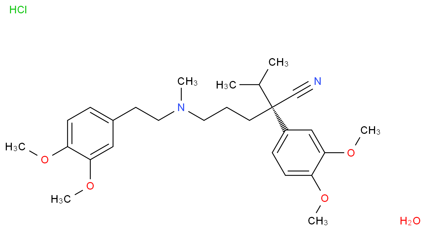 SMILES: CC(C)[C@](CCCN(C)CCc1ccc(c(c1)OC)OC)(C#N)c1ccc(c(c1)OC)OC.O.Cl Canonical SMILES: COc1ccc(cc1OC)CCN(CCC[C@@](c1ccc(c(c1)OC)OC)(C(C)C)C#N)C.O.Cl InChI: InChI=1S/C27H38N2O4.ClH.H2O/c1-20(2)27(19-28,22-10-12-24(31-5)26(18-22)33-7)14-8-15-29(3)16-13-21-9-11-23(30-4)25(17-21)32-6;;/h9-12,17-18,20H,8,13-16H2,1-7H3;1H;1H2/t27-;;/m0../s1 InChIKey: ICKXRKHJKXMFLR-LPCSYZHESA-N