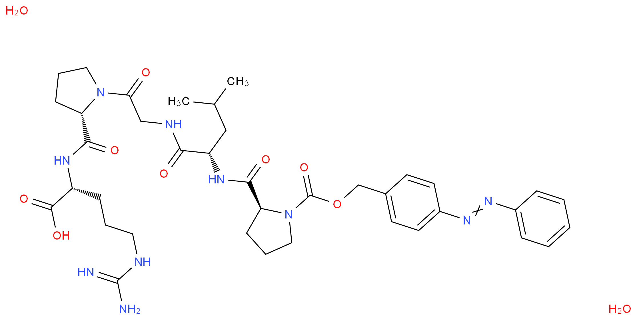 SMILES: CC(C)C[C@@H](C(=O)NCC(=O)N1CCC[C@H]1C(=O)N[C@H](CCCNC(=N)N)C(=O)O)NC(=O)[C@@H]1CCCN1C(=O)OCc1ccc(cc1)/N=N/c1ccccc1.O.O Canonical SMILES: CC(C[C@@H](C(=O)NCC(=O)N1CCC[C@H]1C(=O)N[C@@H](C(=O)O)CCCNC(=N)N)NC(=O)[C@@H]1CCCN1C(=O)OCc1ccc(cc1)/N=N/c1ccccc1)C.O.O InChI: InChI=1S/C38H52N10O8.2H2O/c1-24(2)21-29(33(50)42-22-32(49)47-19-7-12-30(47)34(51)43-28(36(53)54)11-6-18-41-37(39)40)44-35(52)31-13-8-20-48(31)38(55)56-23-25-14-16-27(17-15-25)46-45-26-9-4-3-5-10-26;;/h3-5,9-10,14-17,24,28-31H,6-8,11-13,18-23H2,1-2H3,(H,42,50)(H,43,51)(H,44,52)(H,53,54)(H4,39,40,41);2*1H2/t28-,29+,30+,31+;;/m1../s1 InChIKey: PZUVBRODNGRBBH-ZQJCSZFRSA-N