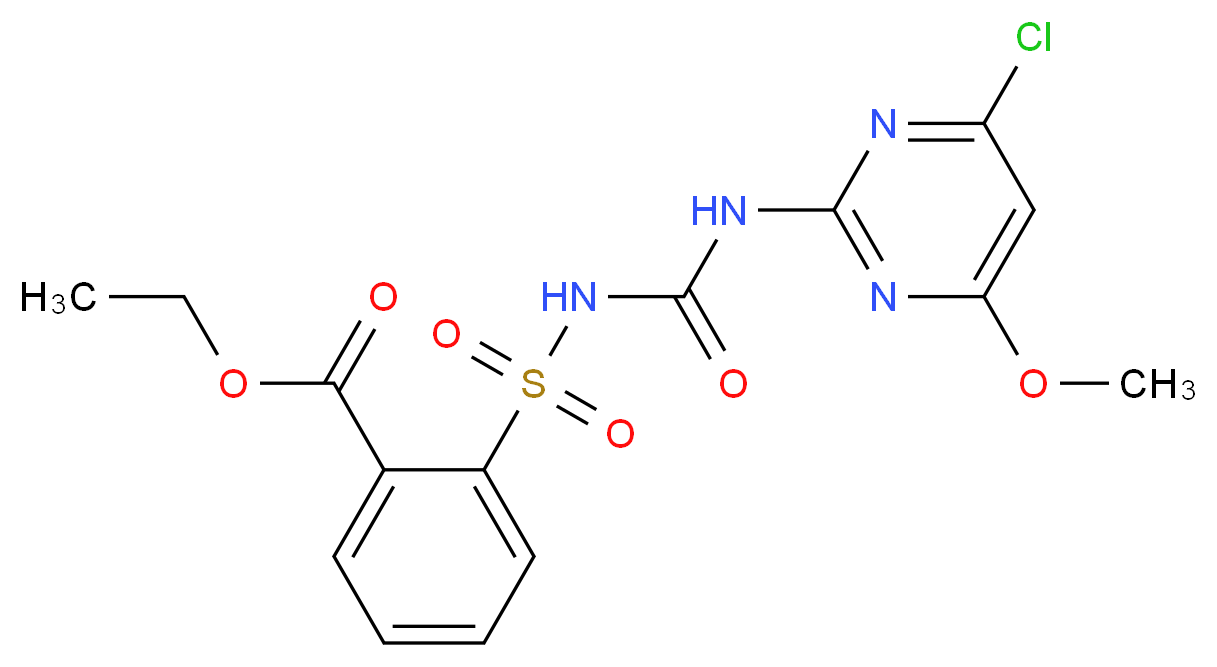 SMILES: CCOC(=O)c1ccccc1S(=O)(=O)NC(=O)Nc1nc(cc(n1)Cl)OC Canonical SMILES: CCOC(=O)c1ccccc1S(=O)(=O)NC(=O)Nc1nc(Cl)cc(n1)OC InChI: InChI=1S/C15H15ClN4O6S/c1-3-26-13(21)9-6-4-5-7-10(9)27(23,24)20-15(22)19-14-17-11(16)8-12(18-14)25-2/h4-8H,3H2,1-2H3,(H2,17,18,19,20,22) InChIKey: NSWAMPCUPHPTTC-UHFFFAOYSA-N