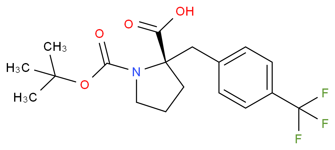 SMILES: CC(C)(C)OC(=O)N1CCC[C@]1(Cc1ccc(cc1)C(F)(F)F)C(=O)O Canonical SMILES: O=C(N1CCC[C@]1(Cc1ccc(cc1)C(F)(F)F)C(=O)O)OC(C)(C)C InChI: InChI=1S/C18H22F3NO4/c1-16(2,3)26-15(25)22-10-4-9-17(22,14(23)24)11-12-5-7-13(8-6-12)18(19,20)21/h5-8H,4,9-11H2,1-3H3,(H,23,24)/t17-/m0/s1 InChIKey: NZVYODUEBIJKKN-KRWDZBQOSA-N