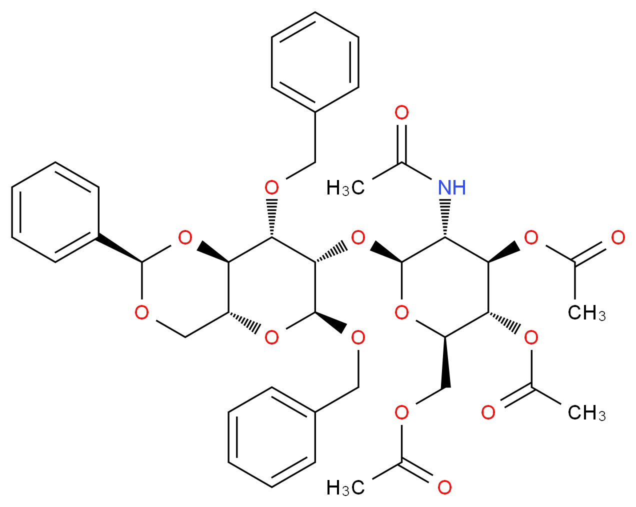 SMILES: [C@H]12[C@@H]([C@@H]([C@H](O[C@@H]1CO[C@H](O2)c1ccccc1)OCc1ccccc1)O[C@H]1[C@H]([C@H]([C@@H]([C@@H](O1)COC(=O)C)OC(=O)C)OC(=O)C)NC(=O)C)OCc1ccccc1 Canonical SMILES: CC(=O)OC[C@@H]1O[C@@H](O[C@@H]2[C@@H](OCc3ccccc3)O[C@H]3[C@H]([C@@H]2OCc2ccccc2)O[C@@H](OC3)c2ccccc2)[C@H]([C@H]([C@@H]1OC(=O)C)OC(=O)C)NC(=O)C InChI: InChI=1S/C41H47NO14/c1-24(43)42-33-36(52-27(4)46)34(51-26(3)45)31(22-47-25(2)44)53-40(33)56-38-37(48-20-28-14-8-5-9-15-28)35-32(23-50-39(55-35)30-18-12-7-13-19-30)54-41(38)49-21-29-16-10-6-11-17-29/h5-19,31-41H,20-23H2,1-4H3,(H,42,43)/t31-,32-,33-,34-,35-,36-,37+,38+,39-,40+,41+/m1/s1 InChIKey: OCFLKKJTMHTQPP-IUZHJWHZSA-N