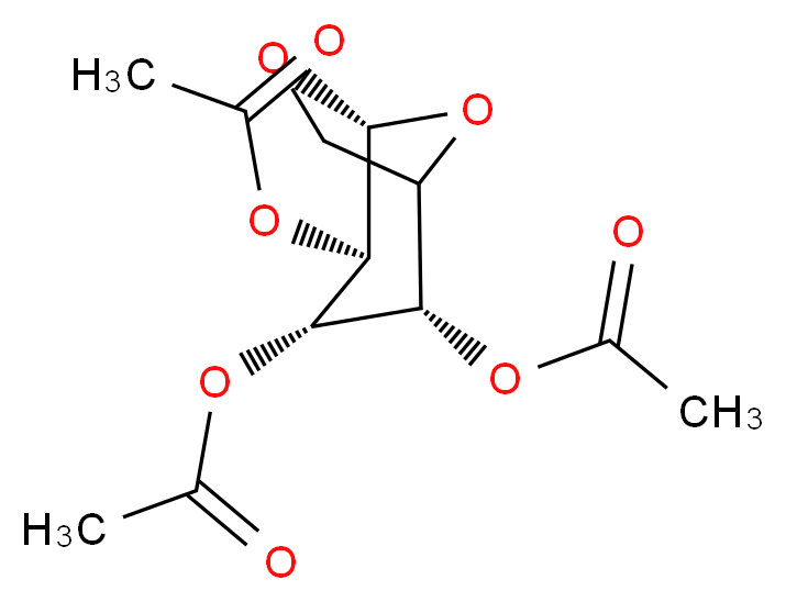 SMILES: [C@H]1([C@@H]([C@@H]([C@H]2OC1CO2)OC(=O)C)OC(=O)C)OC(=O)C Canonical SMILES: CC(=O)O[C@H]1[C@@H](OC(=O)C)C2CO[C@@H]([C@H]1OC(=O)C)O2 InChI: InChI=1S/C12H16O8/c1-5(13)17-9-8-4-16-12(20-8)11(19-7(3)15)10(9)18-6(2)14/h8-12H,4H2,1-3H3/t8?,9-,10-,11+,12+/m0/s1 InChIKey: BAKQMOSGYGQJOJ-SHWDNJPRSA-N