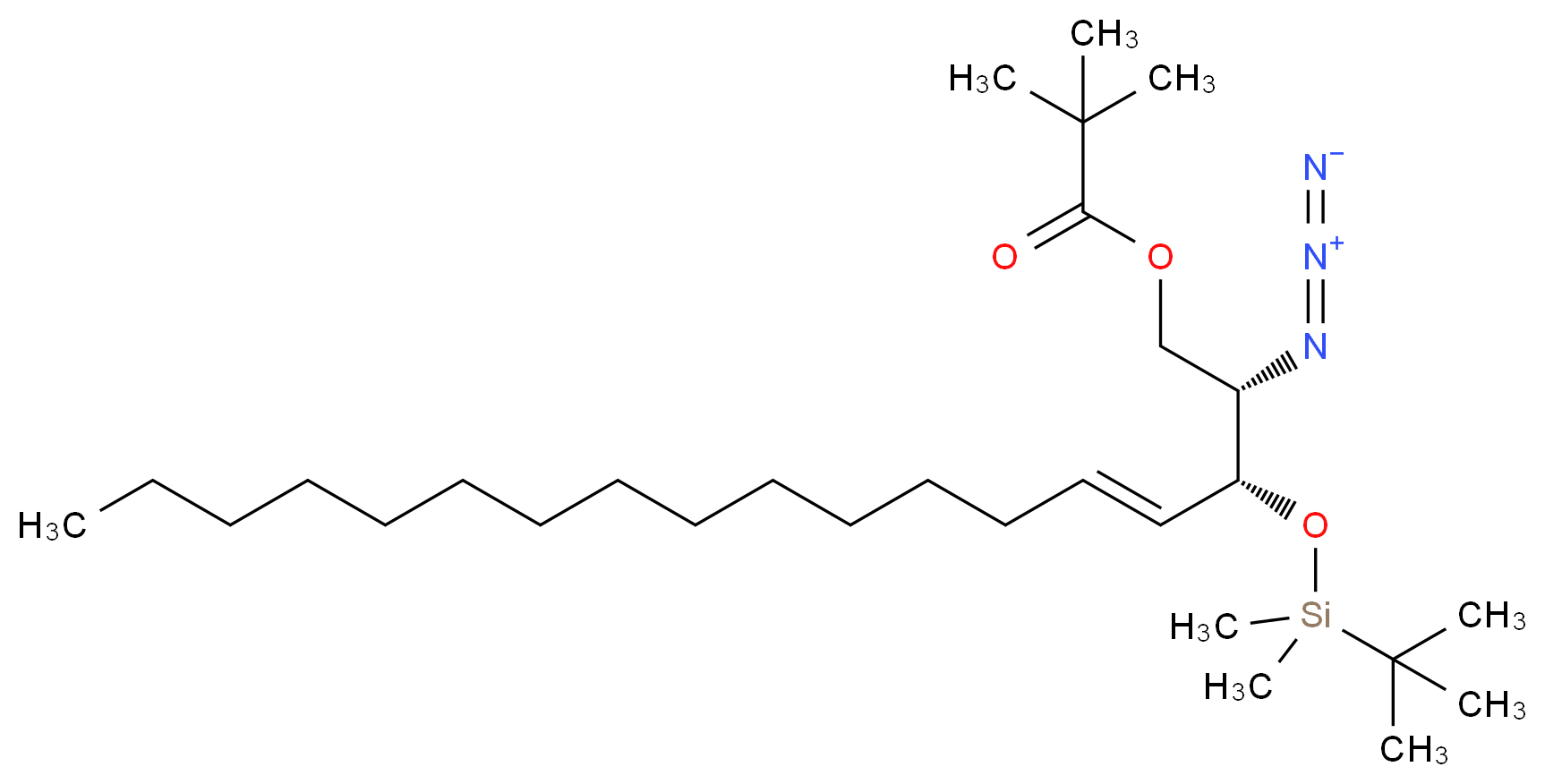 SMILES: O(C[C@@H]([C@@H](/C=C/CCCCCCCCCCCCC)O[Si](C)(C)C(C)(C)C)N=[N+]=[N-])C(=O)C(C)(C)C Canonical SMILES: CCCCCCCCCCCCC/C=C/[C@H]([C@H](COC(=O)C(C)(C)C)N=[N+]=[N-])O[Si](C(C)(C)C)(C)C InChI: InChI=1S/C29H57N3O3Si/c1-10-11-12-13-14-15-16-17-18-19-20-21-22-23-26(35-36(8,9)29(5,6)7)25(31-32-30)24-34-27(33)28(2,3)4/h22-23,25-26H,10-21,24H2,1-9H3/b23-22+/t25-,26+/m0/s1 InChIKey: DFUOSUDIKSYZMW-AMGHMTOGSA-N