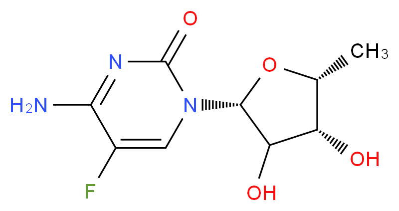 SMILES: [C@H]1(C([C@@H](O[C@@H]1C)n1c(=O)nc(c(c1)F)N)O)O Canonical SMILES: C[C@H]1O[C@H](C([C@H]1O)O)n1cc(F)c(nc1=O)N InChI: InChI=1S/C9H12FN3O4/c1-3-5(14)6(15)8(17-3)13-2-4(10)7(11)12-9(13)16/h2-3,5-6,8,14-15H,1H3,(H2,11,12,16)/t3-,5+,6?,8-/m1/s1 InChIKey: YSNABXSEHNLERR-BNVMRTHCSA-N