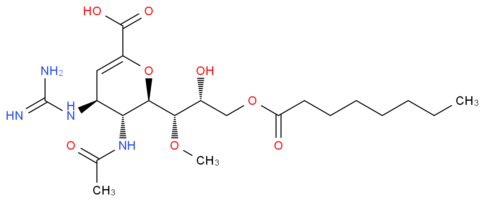 SMILES: C1=C(O[C@H]([C@@H]([C@H]1NC(=N)N)NC(=O)C)[C@H]([C@@H](COC(=O)CCCCCCC)O)OC)C(=O)O Canonical SMILES: CCCCCCCC(=O)OC[C@H]([C@@H]([C@@H]1OC(=C[C@@H]([C@H]1NC(=O)C)NC(=N)N)C(=O)O)OC)O InChI: InChI=1S/C21H36N4O8/c1-4-5-6-7-8-9-16(28)32-11-14(27)18(31-3)19-17(24-12(2)26)13(25-21(22)23)10-15(33-19)20(29)30/h10,13-14,17-19,27H,4-9,11H2,1-3H3,(H,24,26)(H,29,30)(H4,22,23,25)/t13-,14+,17+,18-,19+/m0/s1 InChIKey: UKTIJASCFRNWCB-JCZGSWPSSA-N
