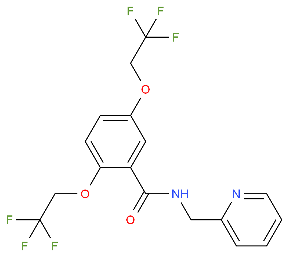 SMILES: c1(ccc(c(c1)C(=O)NCc1ccccn1)OCC(F)(F)F)OCC(F)(F)F Canonical SMILES: O=C(c1cc(OCC(F)(F)F)ccc1OCC(F)(F)F)NCc1ccccn1 InChI: InChI=1S/C17H14F6N2O3/c18-16(19,20)9-27-12-4-5-14(28-10-17(21,22)23)13(7-12)15(26)25-8-11-3-1-2-6-24-11/h1-7H,8-10H2,(H,25,26) InChIKey: YCKWLOJVFNPJAW-UHFFFAOYSA-N