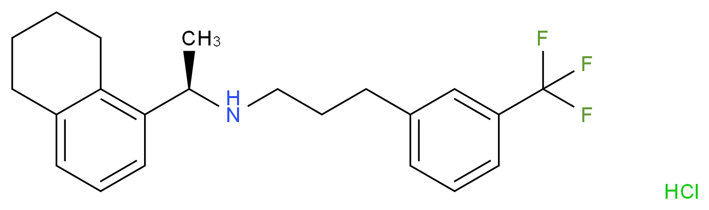 SMILES: c12CCCCc1cccc2[C@H](NCCCc1cccc(c1)C(F)(F)F)C.Cl Canonical SMILES: C[C@H](c1cccc2c1CCCC2)NCCCc1cccc(c1)C(F)(F)F.Cl InChI: InChI=1S/C22H26F3N.ClH/c1-16(20-13-5-10-18-9-2-3-12-21(18)20)26-14-6-8-17-7-4-11-19(15-17)22(23,24)25;/h4-5,7,10-11,13,15-16,26H,2-3,6,8-9,12,14H2,1H3;1H/t16-;/m1./s1 InChIKey: RCYQZFGCGSJOBC-PKLMIRHRSA-N