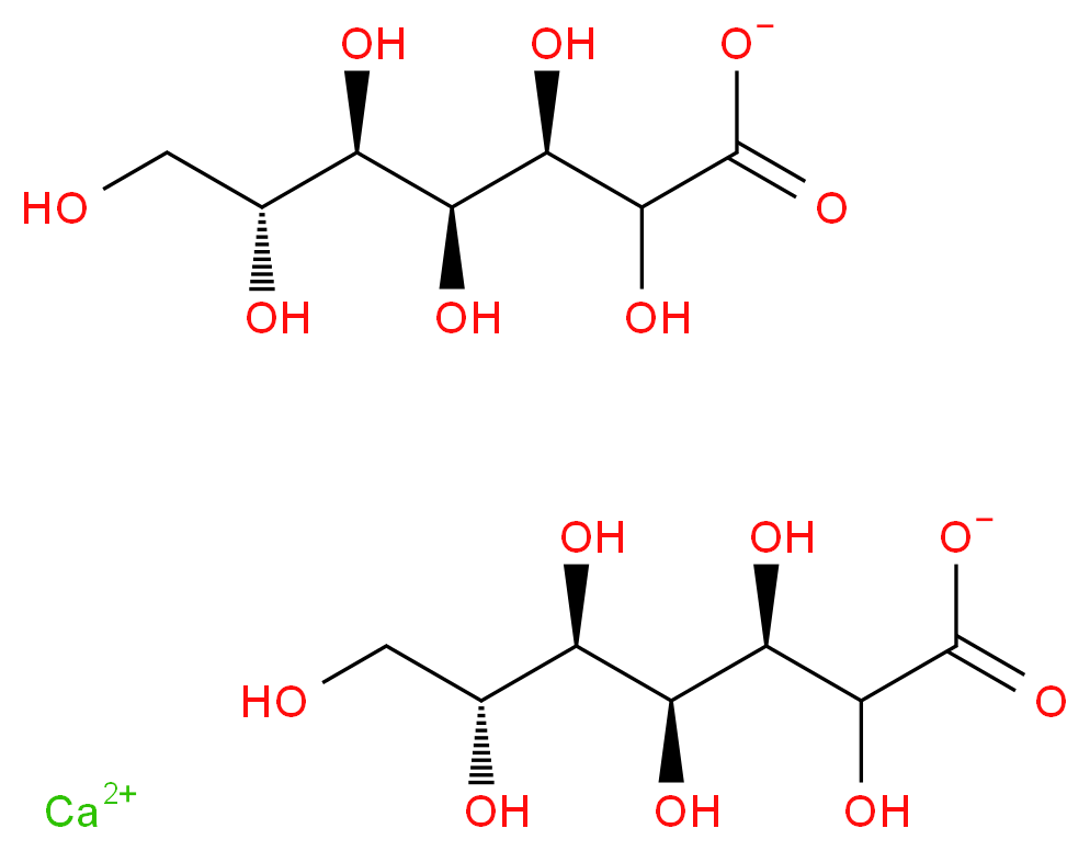 SMILES: [Ca+2].O[C@@H]([C@H](O)[C@H](O)CO)[C@@H](O)C(O)C(=O)[O-].O[C@@H]([C@H](O)[C@H](O)CO)[C@@H](O)C(O)C(=O)[O-] Canonical SMILES: OC[C@H]([C@H]([C@@H]([C@H](C(C(=O)[O-])O)O)O)O)O.OC[C@H]([C@H]([C@@H]([C@H](C(C(=O)[O-])O)O)O)O)O.[Ca+2] InChI: InChI=1S/2C7H14O8.Ca/c2*8-1-2(9)3(10)4(11)5(12)6(13)7(14)15;/h2*2-6,8-13H,1H2,(H,14,15);/q;;+2/p-2/t2*2-,3-,4+,5-,6?;/m11./s1 InChIKey: FATUQANACHZLRT-KMRXSBRUSA-L