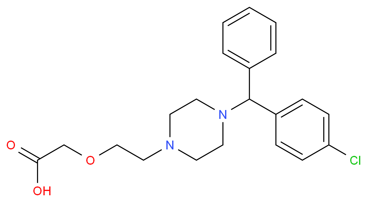 SMILES: Clc1ccc(C(N2CCN(CC2)CCOCC(=O)O)c2ccccc2)cc1 Canonical SMILES: OC(=O)COCCN1CCN(CC1)C(c1ccc(cc1)Cl)c1ccccc1 InChI: InChI=1S/C21H25ClN2O3/c22-19-8-6-18(7-9-19)21(17-4-2-1-3-5-17)24-12-10-23(11-13-24)14-15-27-16-20(25)26/h1-9,21H,10-16H2,(H,25,26) InChIKey: ZKLPARSLTMPFCP-UHFFFAOYSA-N