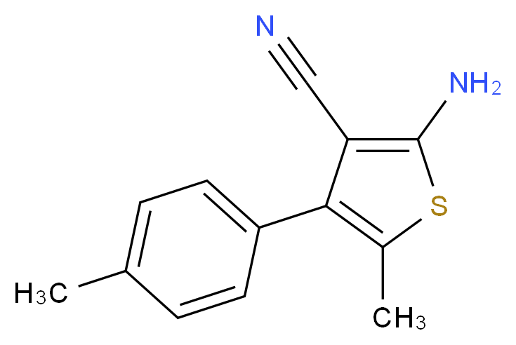 SMILES: c1(c(sc(c1c1ccc(cc1)C)C)N)C#N Canonical SMILES: N#Cc1c(N)sc(c1c1ccc(cc1)C)C InChI: InChI=1S/C13H12N2S/c1-8-3-5-10(6-4-8)12-9(2)16-13(15)11(12)7-14/h3-6H,15H2,1-2H3 InChIKey: RHICPTFVQDHWOQ-UHFFFAOYSA-N