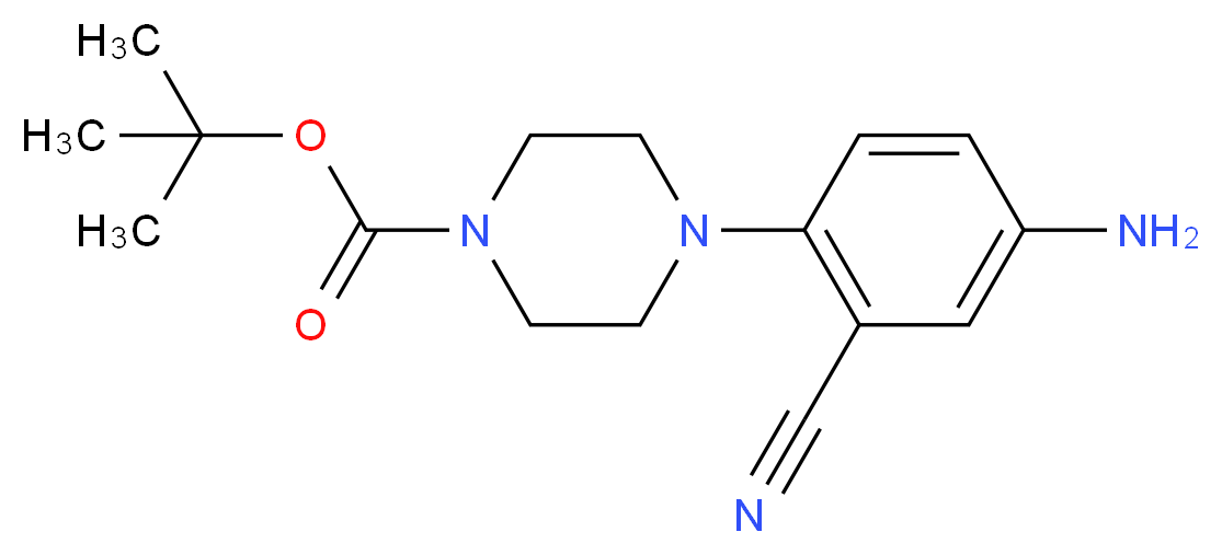 SMILES: CC(C)(C)OC(=O)N1CCN(CC1)c1c(cc(N)cc1)C#N Canonical SMILES: N#Cc1cc(N)ccc1N1CCN(CC1)C(=O)OC(C)(C)C InChI: InChI=1S/C16H22N4O2/c1-16(2,3)22-15(21)20-8-6-19(7-9-20)14-5-4-13(18)10-12(14)11-17/h4-5,10H,6-9,18H2,1-3H3 InChIKey: MATLRBKMCBPXPB-UHFFFAOYSA-N