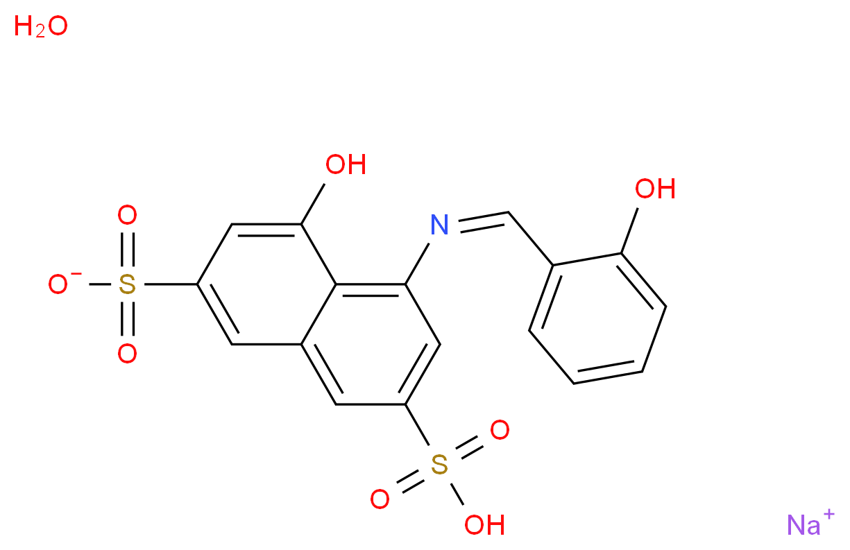 SMILES: c1ccc(c(c1)/C=N\c1cc(cc2c1c(cc(c2)S(=O)(=O)[O-])O)S(=O)(=O)O)O.[Na+].O Canonical SMILES: Oc1ccccc1/C=N\c1cc(cc2c1c(O)cc(c2)S(=O)(=O)[O-])S(=O)(=O)O.O.[Na+] InChI: InChI=1S/C17H13NO8S2.Na.H2O/c19-15-4-2-1-3-10(15)9-18-14-7-12(27(21,22)23)5-11-6-13(28(24,25)26)8-16(20)17(11)14;;/h1-9,19-20H,(H,21,22,23)(H,24,25,26);;1H2/q;+1;/p-1/b18-9-;; InChIKey: AAIGDXDVSZJVSW-SNHBZXLGSA-M