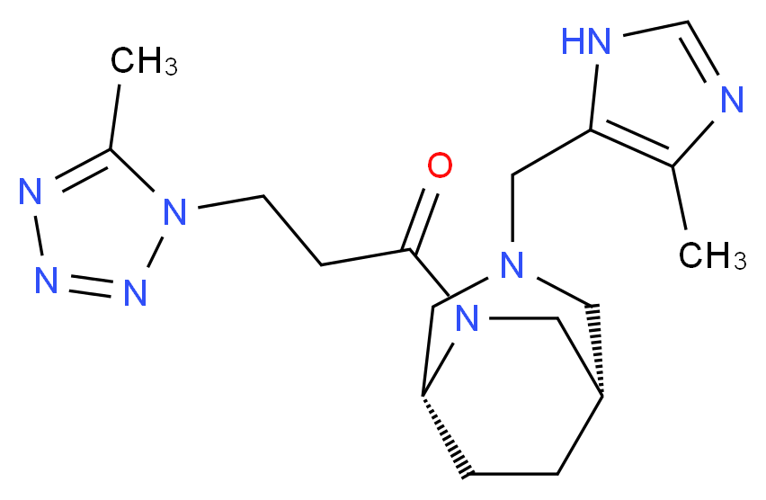 SMILES: n1nn(c(n1)C)CCC(=O)N1[C@H]2CN(Cc3c(nc[nH]3)C)C[C@@H](C1)CC2 Canonical SMILES: O=C(N1C[C@H]2CC[C@@H]1CN(C2)Cc1[nH]cnc1C)CCn1nnnc1C InChI: InChI=1S/C17H26N8O/c1-12-16(19-11-18-12)10-23-7-14-3-4-15(9-23)24(8-14)17(26)5-6-25-13(2)20-21-22-25/h11,14-15H,3-10H2,1-2H3,(H,18,19)/t14-,15+/m0/s1 InChIKey: ITRHBVJAQOAHDL-LSDHHAIUSA-N