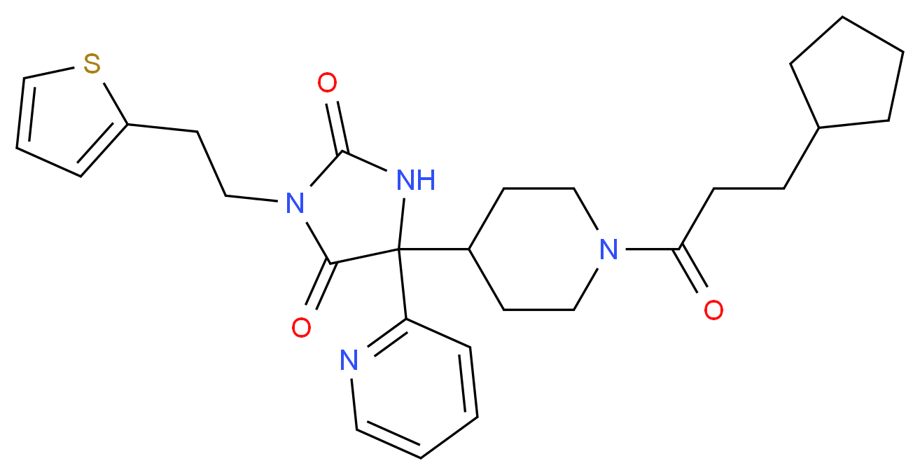 SMILES: N1(C(=O)C(NC1=O)(c1ncccc1)C1CCN(C(=O)CCC2CCCC2)CC1)CCc1sccc1 Canonical SMILES: O=C(N1CCC(CC1)C1(NC(=O)N(C1=O)CCc1cccs1)c1ccccn1)CCC1CCCC1 InChI: InChI=1S/C27H34N4O3S/c32-24(11-10-20-6-1-2-7-20)30-16-12-21(13-17-30)27(23-9-3-4-15-28-23)25(33)31(26(34)29-27)18-14-22-8-5-19-35-22/h3-5,8-9,15,19-21H,1-2,6-7,10-14,16-18H2,(H,29,34) InChIKey: JVTNGQJQNPYMNP-UHFFFAOYSA-N