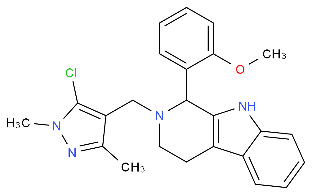 SMILES: c1(c(n(nc1C)C)Cl)CN1C(c2c(c3c([nH]2)cccc3)CC1)c1c(OC)cccc1 Canonical SMILES: COc1ccccc1C1N(CCc2c1[nH]c1c2cccc1)Cc1c(C)nn(c1Cl)C InChI: InChI=1S/C24H25ClN4O/c1-15-19(24(25)28(2)27-15)14-29-13-12-17-16-8-4-6-10-20(16)26-22(17)23(29)18-9-5-7-11-21(18)30-3/h4-11,23,26H,12-14H2,1-3H3 InChIKey: XBCYGIGQSHMKHM-UHFFFAOYSA-N