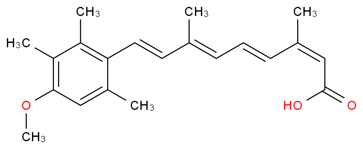 SMILES: O(c1c(c(c(c(c1)C)/C=C/C(=C/C=C/C(=C\C(=O)O)/C)/C)C)C)C Canonical SMILES: COc1cc(C)c(c(c1C)C)/C=C/C(=C/C=C/C(=C\C(=O)O)/C)/C InChI: InChI=1S/C21H26O3/c1-14(8-7-9-15(2)12-21(22)23)10-11-19-16(3)13-20(24-6)18(5)17(19)4/h7-13H,1-6H3,(H,22,23)/b9-7+,11-10+,14-8+,15-12- InChIKey: IHUNBGSDBOWDMA-UGOGCBOOSA-N