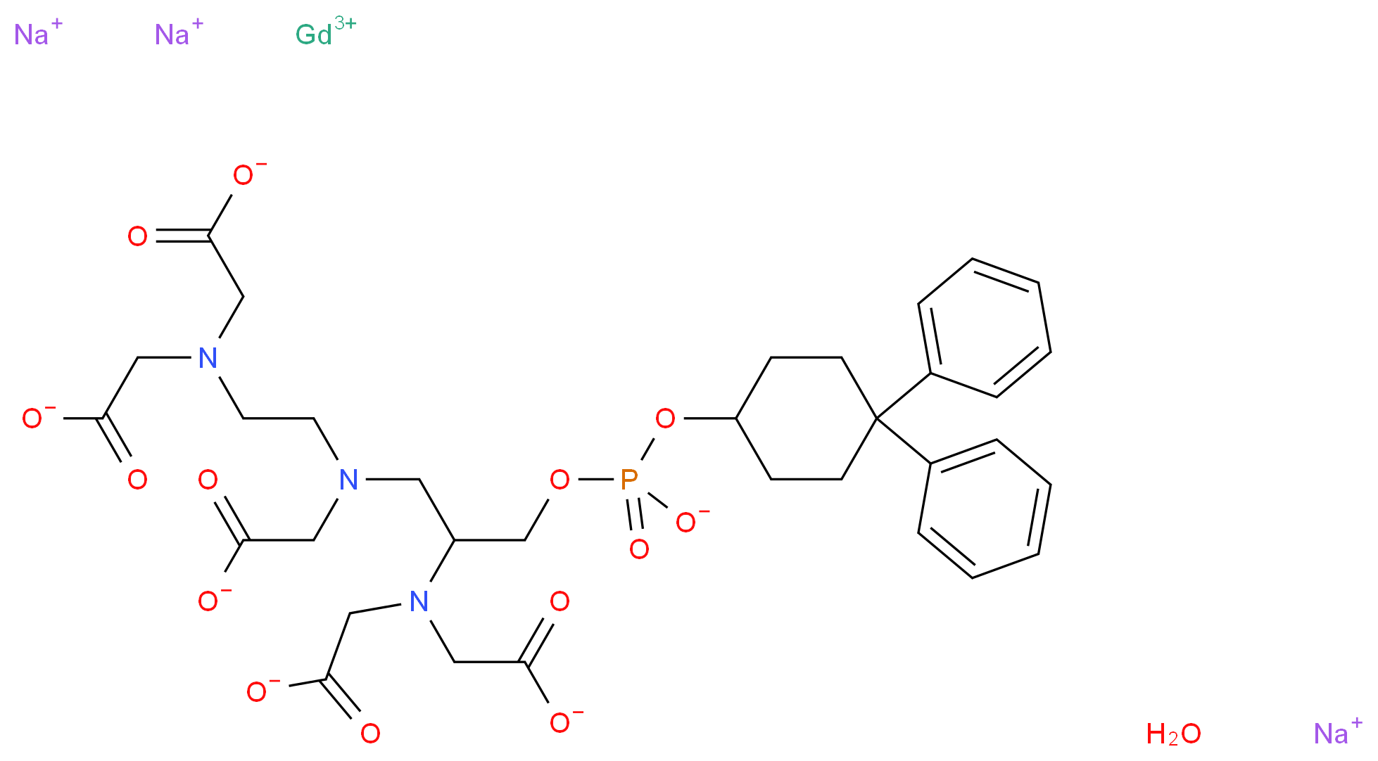 SMILES: C1CC(CCC1OP(=O)([O-])OCC(CN(CCN(CC(=O)[O-])CC(=O)[O-])CC(=O)[O-])N(CC(=O)[O-])CC(=O)[O-])(c1ccccc1)c1ccccc1.O.[Na+].[Na+].[Na+].[Gd+3] Canonical SMILES: [O-]C(=O)CN(C(CN(CC(=O)[O-])CCN(CC(=O)[O-])CC(=O)[O-])COP(=O)(OC1CCC(CC1)(c1ccccc1)c1ccccc1)[O-])CC(=O)[O-].O.[Na+].[Na+].[Na+].[Gd+3] InChI: InChI=1S/C33H44N3O14P.Gd.3Na.H2O/c37-28(38)18-34(15-16-35(19-29(39)40)20-30(41)42)17-26(36(21-31(43)44)22-32(45)46)23-49-51(47,48)50-27-11-13-33(14-12-27,24-7-3-1-4-8-24)25-9-5-2-6-10-25;;;;;/h1-10,26-27H,11-23H2,(H,37,38)(H,39,40)(H,41,42)(H,43,44)(H,45,46)(H,47,48);;;;;1H2/q;+3;3*+1;/p-6 InChIKey: PIZALBORPSCYJU-UHFFFAOYSA-H