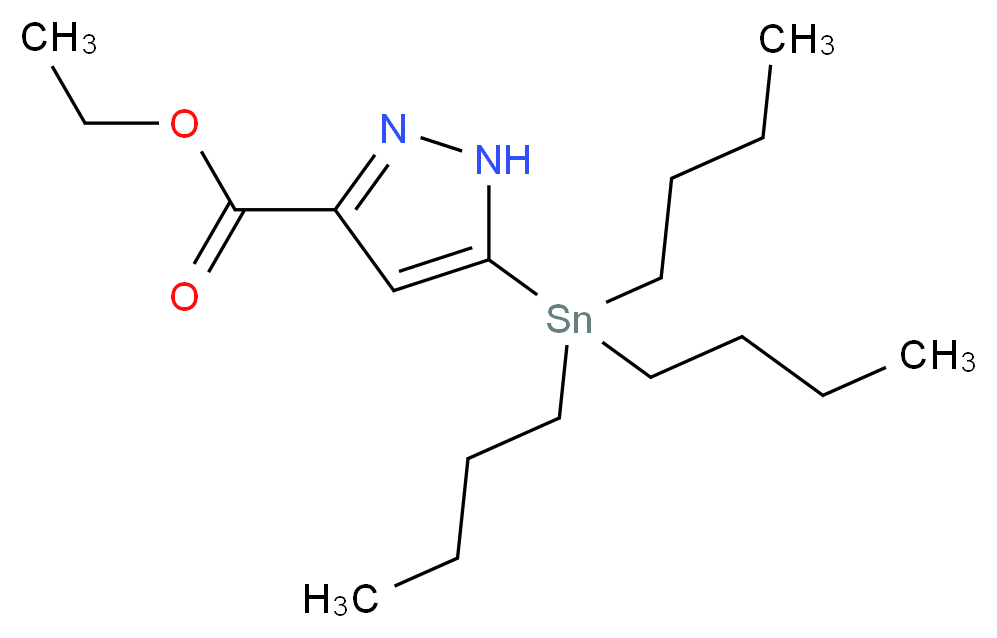 SMILES: [nH]1c(cc(n1)C(=O)OCC)[Sn](CCCC)(CCCC)CCCC Canonical SMILES: CCCC[Sn](c1[nH]nc(c1)C(=O)OCC)(CCCC)CCCC InChI: InChI=1S/C6H7N2O2.3C4H9.Sn/c1-2-10-6(9)5-3-4-7-8-5;3*1-3-4-2;/h3H,2H2,1H3,(H,7,8);3*1,3-4H2,2H3; InChIKey: IVTNFPBKDVQZLF-UHFFFAOYSA-N