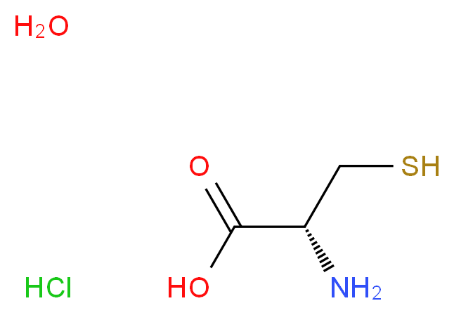 SMILES: Cl.C(=O)([C@H](CS)N)O.O Canonical SMILES: N[C@H](C(=O)O)CS.O.Cl InChI: InChI=1S/C3H7NO2S.ClH.H2O/c4-2(1-7)3(5)6;;/h2,7H,1,4H2,(H,5,6);1H;1H2/t2-;;/m0../s1 InChIKey: QIJRTFXNRTXDIP-JIZZDEOASA-N