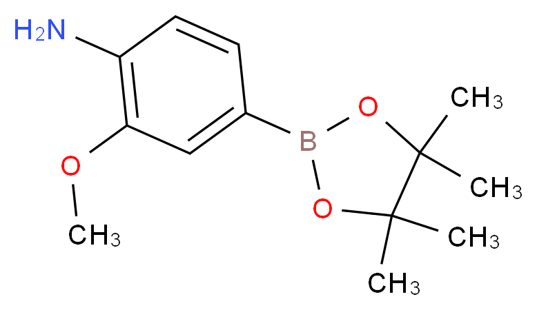SMILES: B1(c2cc(c(cc2)N)OC)OC(C)(C)C(O1)(C)C Canonical SMILES: COc1cc(ccc1N)B1OC(C(O1)(C)C)(C)C InChI: InChI=1S/C13H20BNO3/c1-12(2)13(3,4)18-14(17-12)9-6-7-10(15)11(8-9)16-5/h6-8H,15H2,1-5H3 InChIKey: KEMUFKXFCINKAA-UHFFFAOYSA-N