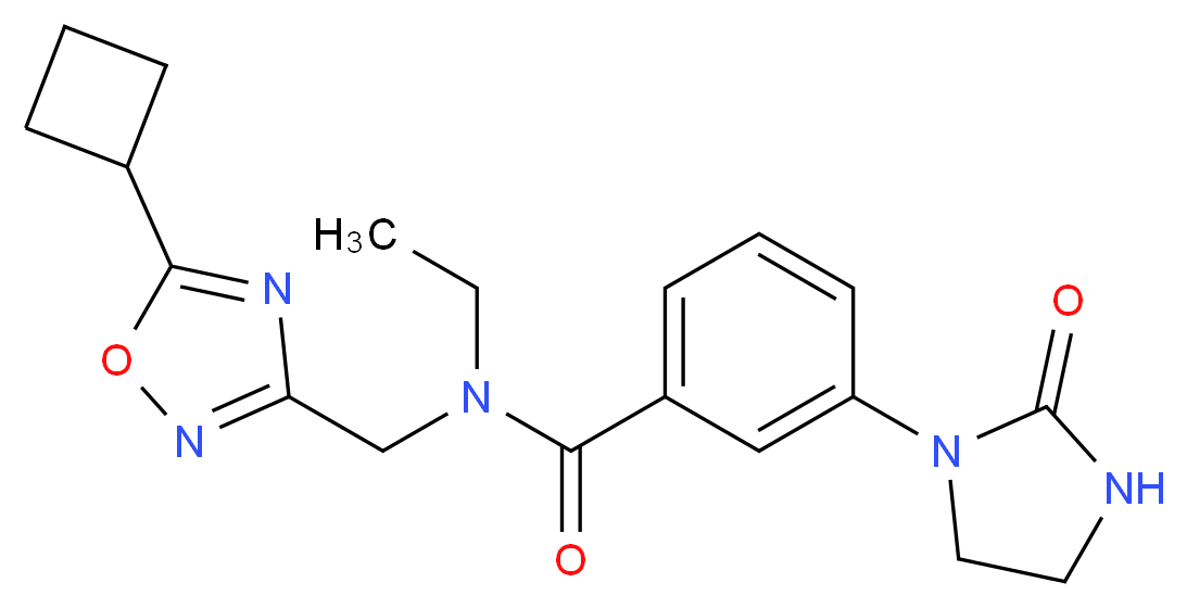SMILES: n1c(noc1C1CCC1)CN(C(=O)c1cc(N2C(=O)NCC2)ccc1)CC Canonical SMILES: CCN(C(=O)c1cccc(c1)N1CCNC1=O)Cc1noc(n1)C1CCC1 InChI: InChI=1S/C19H23N5O3/c1-2-23(12-16-21-17(27-22-16)13-5-3-6-13)18(25)14-7-4-8-15(11-14)24-10-9-20-19(24)26/h4,7-8,11,13H,2-3,5-6,9-10,12H2,1H3,(H,20,26) InChIKey: DCPDAQPQNUHAFW-UHFFFAOYSA-N